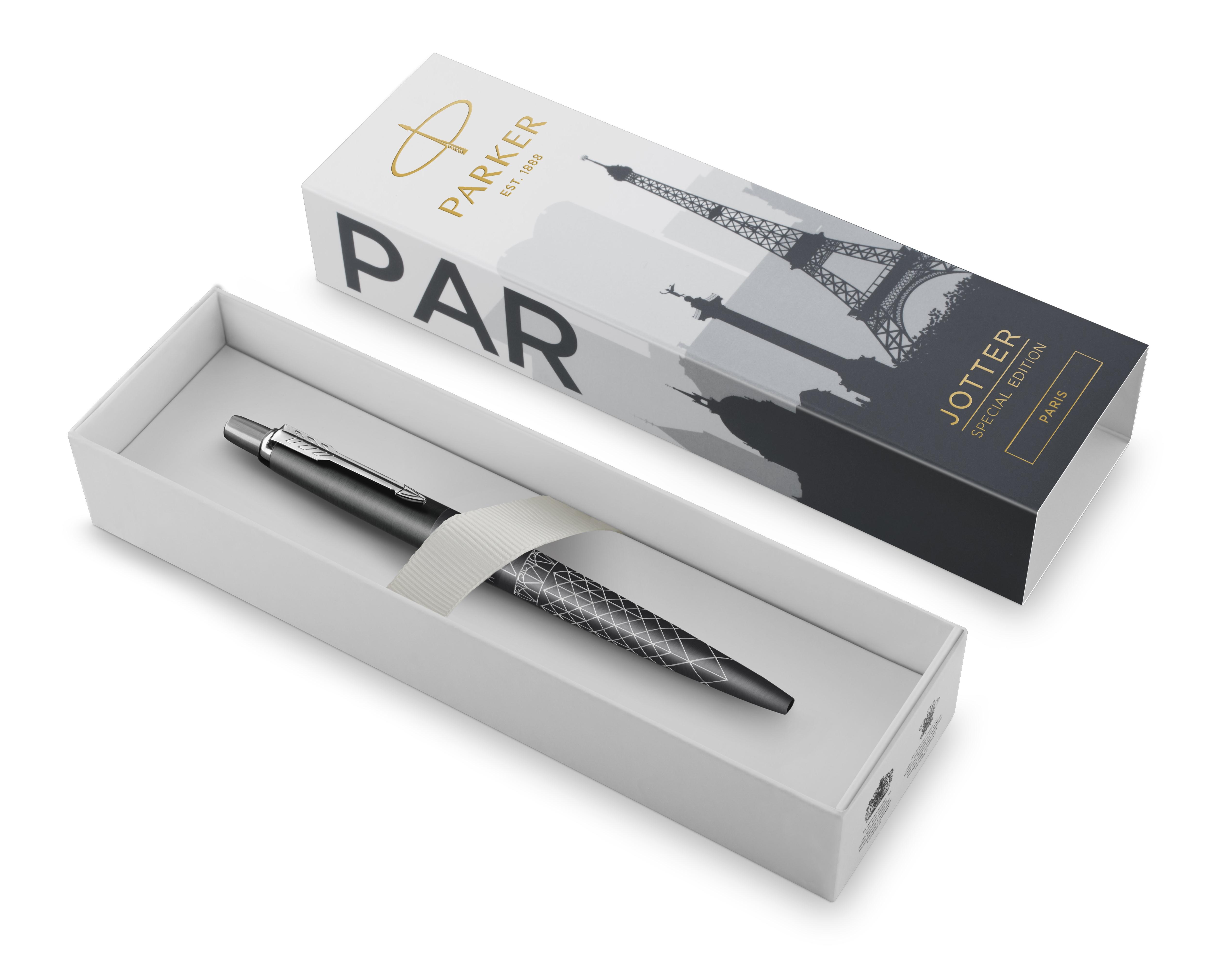 Ручка шариковая Parker "Jotter Paris Grey CT" из серии "мировые мегаполисы" посвящена Парижу. Линия письма- средняя, цвет письма- синий. Корпус ручки изготовлен из нержавеющей стали, покрыт серым матовым лаком с лазерной гравировкой. Вдохновленный романтическим Парижем, этот новейший Jotter отражает архитектурные элементы величественного города любви. Ручка упакована в оригинальную картонную подарочную коробку Parker, которая демонстрирует вечную красоту таких достопримечательностей, как Эйфелева башня и Собор Парижской Богоматери. Сделано во Франции.